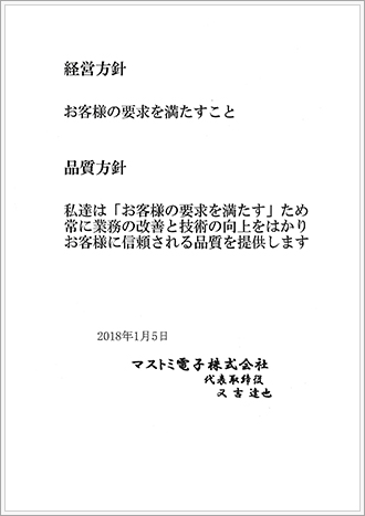 私たちは「お客様の要求を満たす」ために業務の改善と技術の向上をはかりお客様に信頼される品質を提供します。